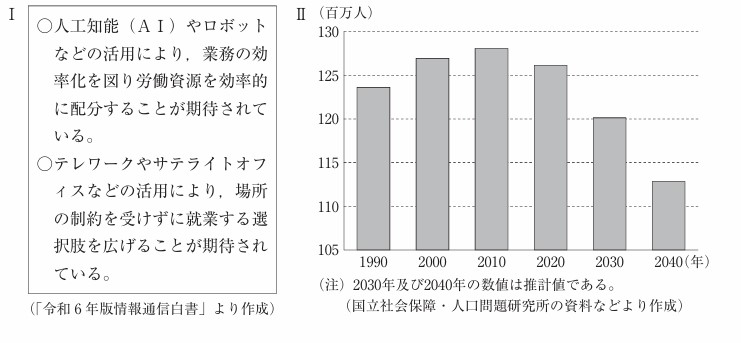 (4)労働分野においても、情報通信技術(ICT)の活用が一層進むことが予想されている。とあるが、次のⅠの文章は,令和6年版情報通信白書の一部を分かりやすくまとめたものである。Ⅱのグラフは、1990年から2040年までの我が国の人口の推移を示したものである。