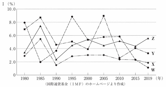で示したW〜Zのそれぞれの国の、1980年から2019年までの経済成長率の推移を示したものである。Ⅱの文章で述べている国に当てはまるのは、略地図中のW〜Zのうちのどれか。