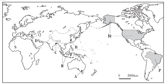 A~Dのうち、年間を通して高温になるのは赤道付近にあるCである。