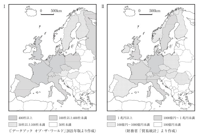 略地図Ⅰより、400社以上の日系現地法人数があるのは「イギリス」「ドイツ」「フランス」です。