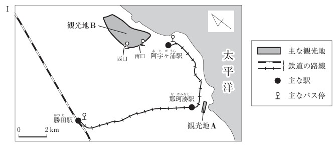 次のⅠの略地図は、2024年における茨城県ひたちなか市の主な観光地、鉄道の路線、主な駅、 主なバス停を示したものである。Ⅱの文章は、Ⅰで示した観光地A、観光地Bに鉄道や路線バスなどを利用して行く方法を示したものである。Ⅲの文は、2024年に国から工事施行認可を取得した、茨城県ひたちなか市における鉄道の延伸計画の内容の一部を分かりやすく書き改めたものである。Ⅰ〜Ⅲの資料から読み取れる、Ⅲが実施された後の観光地Aと観光地Bの間を移動する場合の交通の利便性の変化について、Ⅲが実施される前と比較し、移動手段に着目して、簡単に述べよ。