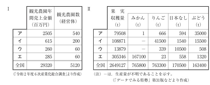 で示したW〜Zのいずれかの県に当てはまる。Ⅰの表は、2020年度における観光農園年間売上金額、観光農園数を示したものである。Ⅱの表は、2020年における果実収穫量、果実収穫量のうち、みかん、りんご、日本なし、 ぶどうの収穫量を示したものである。次のページのⅢの文章は、略地図中のW〜Zのいずれかの県の農業などの様子について述べたものである。Ⅲの文章で述べている県に当てはまるのは、略地図中のW〜Zのうちのどれか、また、ⅠとⅡの表のア〜エのうちのどれか。