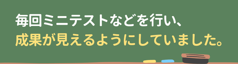 また、毎回ミニテストや英単語暗記チェックなどを行い、成果が見えるようにしていました。