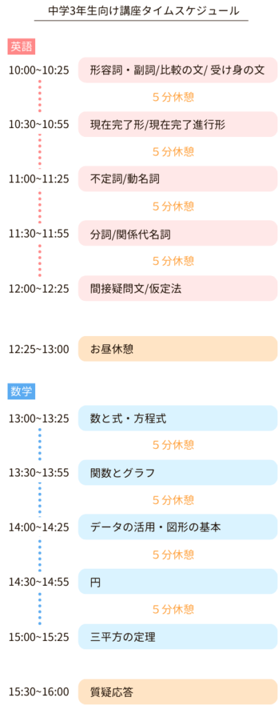 冬の特別講習は、英語・数学の重要なポイントを25分×5コマの集中講座でわかりやすく指導!