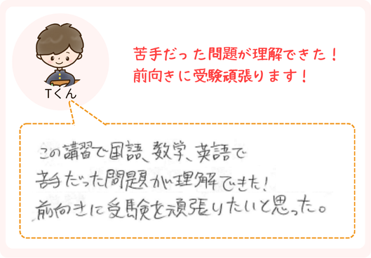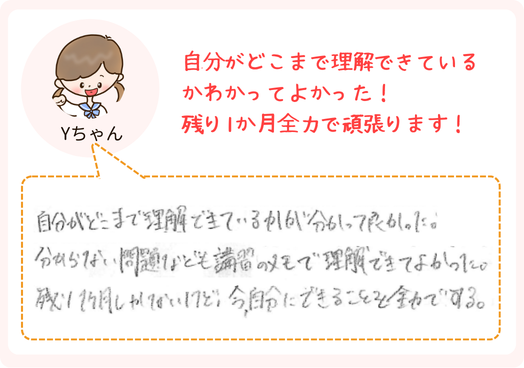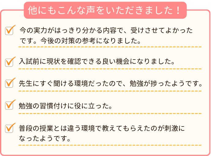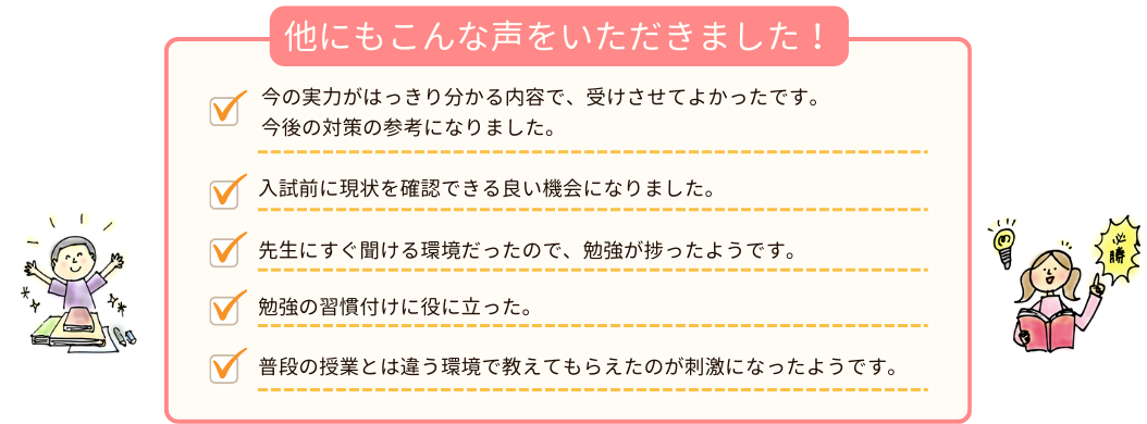 「本番を想定して対策ができたおかげで、入試当日も落ち着いて解くことができた!」など嬉しいお声もいただきました。