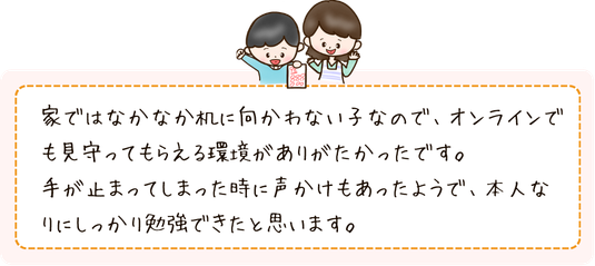 オンラインでも、様子が見える環境で見守られていることで、集中力して取り組めたお子さんが多かったようです。