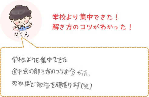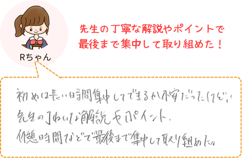 「わからなかったところがわかるようになった!」「丁寧に教えてもらえたから集中できた!」など、前向きに取り組めたといったお声をたくさんいただきました。