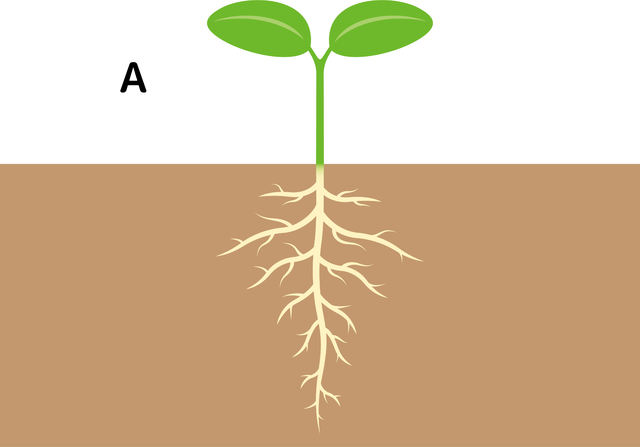 植物によって、Aのように太い 主根 とそこから生える 側根 をもつものや、Bのようにひげ根 をもつものがあります。