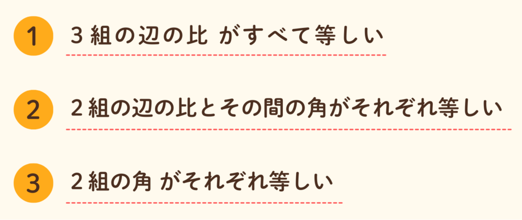 三角形の相似条件は次の3つです。実際に相似する2つの三角形を書いてみて、3つの条件がそれぞれ成立していることを確かめてみましょう!