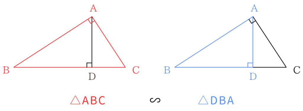 仮定は ∠BAC =∠BDA = 90° であること、結論は△ABC∽△DBAであることです。では、今回の場合は相似条件のうちのどれに当てはまりそうか考えていきます。まず、角度が等しいものがあるという時点で「3組の辺の比がすべて等しい」は選択肢として薄くなります。角度を等しいと開示しておいて、それを使わない相似条件を使用することは考えにくいからです。次に2つの三角形が重なり合っているところを見ていきます。すると、∠Bが、どちらの三角形も共有していることがわかります。つまりこれがもう一つの等しい角度になります。よって、今回の相似条件は「2組の角度がそれぞれ等しい」であるとわかります。