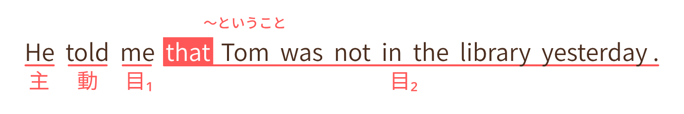 まず最初は「彼は私に語った」で”He(主) told(動) me(目₁)”、残りは「昨日トムは図書館にいなかった」です。これは”Tom was not in the library yesterday” と表現できます。この部分が(目₂)となります。