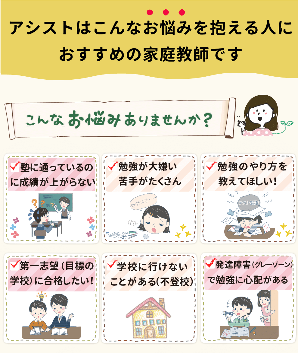 家庭教師のやる気アシストでは、不登校や発達障害の特性をお持ちのお子さんの指導実績が多数です。お子さんの希望の目標や進路に合わせて、学習面・習慣を指導サポートしていきます。